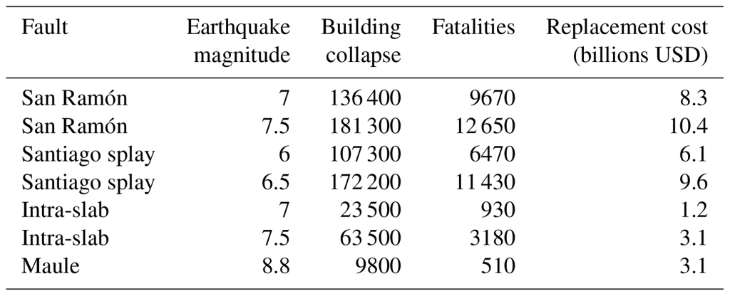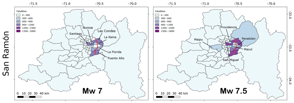 For the San Ramón rupture scenario in the magnitude range 7–7.5 under the current residential exposure, we would anticipate over 100,000 building collapses, 10,000+ fatalities and a replacement cost of 8-10 billion USD. For all our scenarios, the most vulnerable building class is unreinforced masonry, while reinforced concrete and wooden structures are the most resilient to earthquake shaking. Therefore, effective near-term risk reduction measures could target unreinforced masonry homes for retrofitting campaigns, particularly in Ñuñoa, Santiago and Macul, while in the mid-long term a drive towards reinforced concrete homes would significantly reduce the risks to future earthquakes both from near and far-field sources.